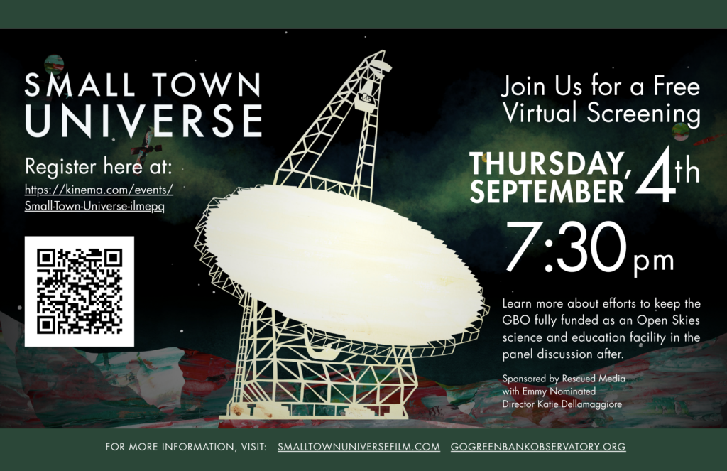 To learn more about this screening and how to register, visit: https://www.gogreenbankobservatory.org/small-town-universe-news/